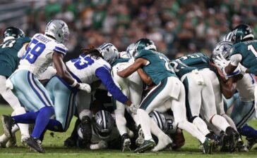 Sep 4, 2025; Philadelphia, Pennsylvania, USA; The Philadelphia Eagles execute a tush push for a first down against the Dallas...