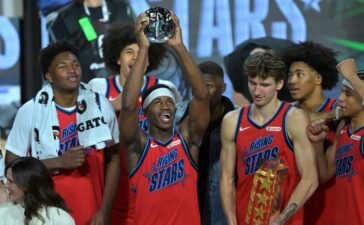 Feb 13, 2026; Inglewood, California, USA; Team Vince guard VJ Edgecombe (77) of the Philadelphia 76ers reacts with the MVP...