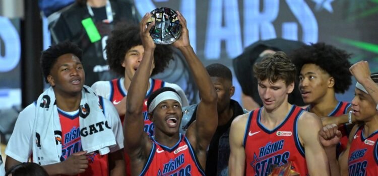 Feb 13, 2026; Inglewood, California, USA; Team Vince guard VJ Edgecombe (77) of the Philadelphia 76ers reacts with the MVP trophy after defeating Team Melo during an NBA All Star Rising Stars championship game at Intuit Dome. Mandatory Credit: Jayne...