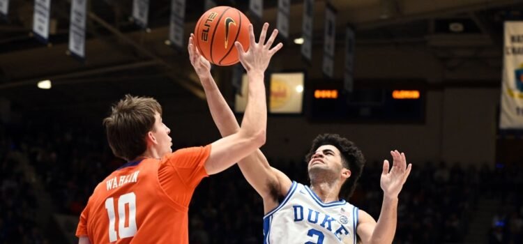 Feb 14, 2026; Durham, North Carolina, USA; Duke Blue Devils guard Cayden Boozer (2) lays the ball up over Clemson Tigers forward Jake Whalin (10) during the second half at Cameron Indoor Stadium. Mandatory Credit: Rob Kinnan-Imagn Images Freshman Cameron...
