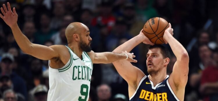 Feb 25, 2026; Denver, Colorado, USA; Denver Nuggets center Nikola Jokic (15) looks to pass the ball as he is defended by Boston Celtics guard Derrick White (9) during the first half at Ball Arena. Mandatory Credit: Christopher Hanewinckel-Imagn Images...