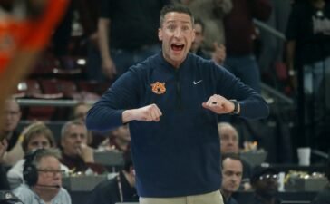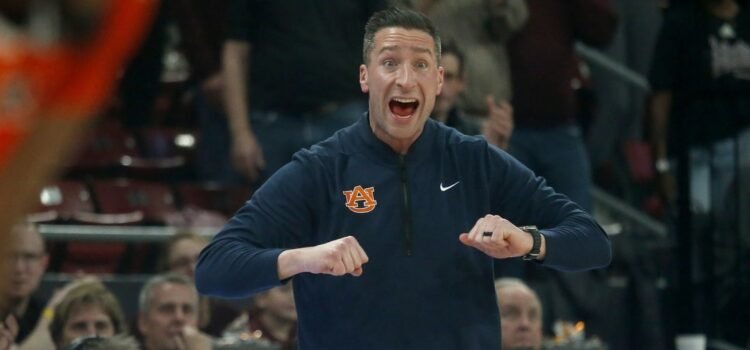 Feb 18, 2026; Starkville, Mississippi, USA; Auburn Tigers head coach Steven Pearl reacts during the second half against the Mississippi State Bulldogs at Humphrey Coliseum. Mandatory Credit: Petre Thomas-Imagn Images Tahaad Pettiford scored eight of his game-high 27 points during...