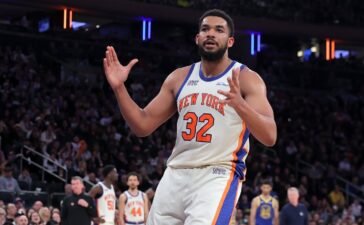 Mar 15, 2026; New York, New York, USA; New York Knicks center Karl-Anthony Towns (32) reacts during the third quarter...