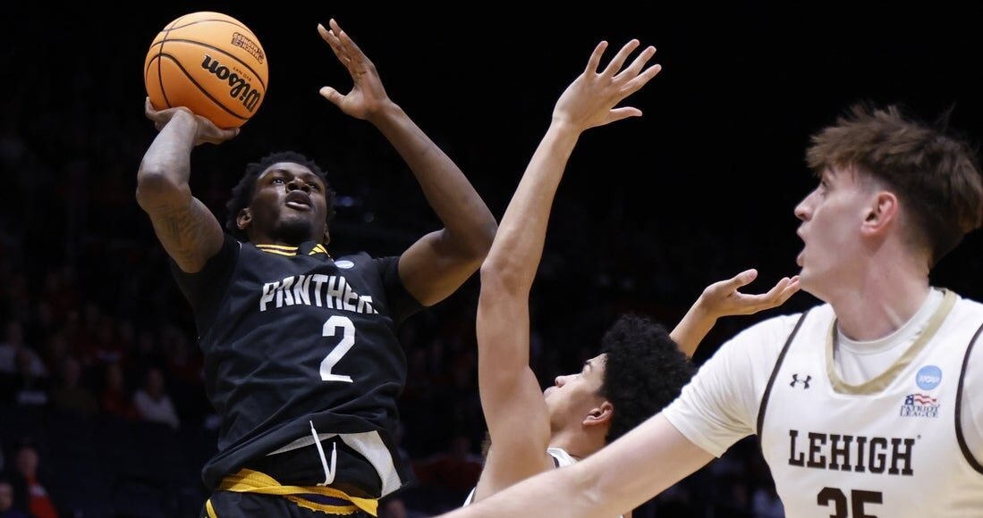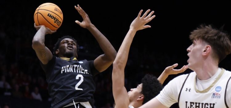 Mar 18, 2026; Dayton, OH, USA; Prairie View A&M Panthers guard Dontae Horne (2) shoots the ball over Lehigh Mountain Hawks guard Joshua Ingram (4) in the first half during a first four game of the men's 2026 NCAA Tournament...