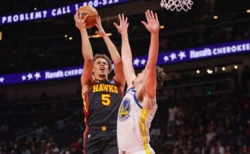 Mar 21, 2026; Atlanta, Georgia, USA; Atlanta Hawks guard Dyson Daniels (5) shoots over Golden State Warriors center Quinten Post...