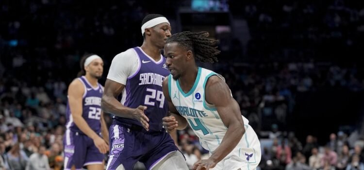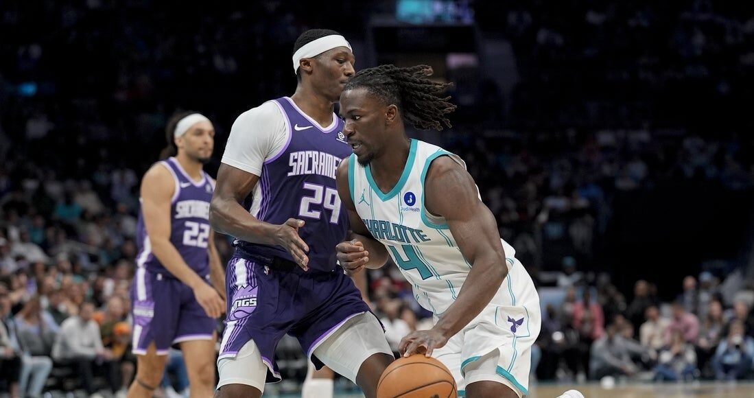 Mar 24, 2026; Charlotte, North Carolina, USA; Charlotte Hornets guard Sion James (4) moves the ball against Sacramento Kings guard/forward Daeqwon Plowden (29) during the second half at Spectrum Center. Mandatory Credit: Jim Dedmon-Imagn Images Charlotte matched a franchise record...
