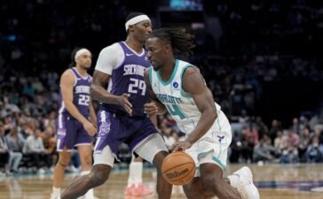 Mar 24, 2026; Charlotte, North Carolina, USA; Charlotte Hornets guard Sion James (4) moves the ball against Sacramento Kings guard/forward...