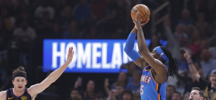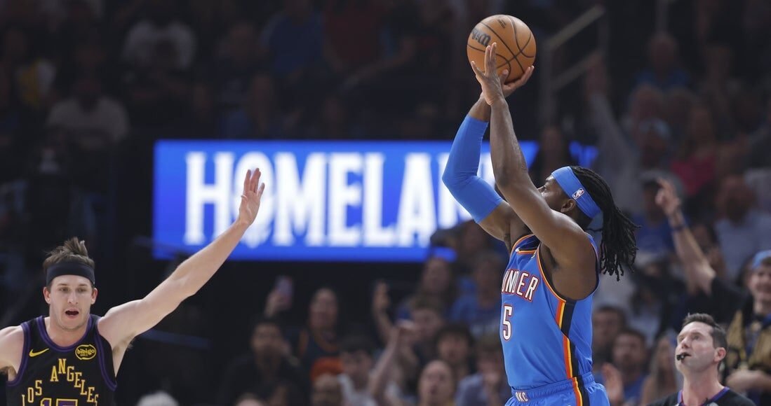 Apr 2, 2026; Oklahoma City, Oklahoma, USA; Oklahoma City Thunder guard Luguentz Dort (5) shoots a three point basket as Los Angeles Lakers guard Austin Reaves (15) defends during the first quarter at Paycom Center. Mandatory Credit: Alonzo Adams-Imagn Images...