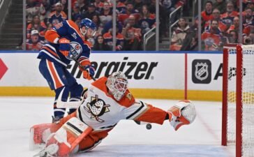 Apr 20, 2026; Edmonton, Alberta, CAN; Edmonton Oilers center Jason Dickinson (16) shoots the puck to Anaheim Ducks goalie Lukas Dostal (1) in game one of the first round of the 2026 Stanley Cup Playoffs during the first period at...