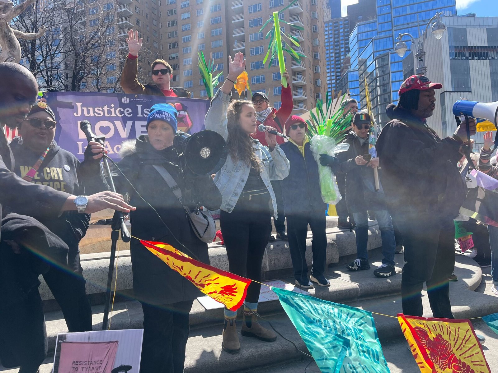 The crowd chanted songs that have become staples of progressive religious activist groups over the past year, including “We will protect each other.” The song was taught to religious activists at a “Singing Resistance” event in March at Riverside Church.