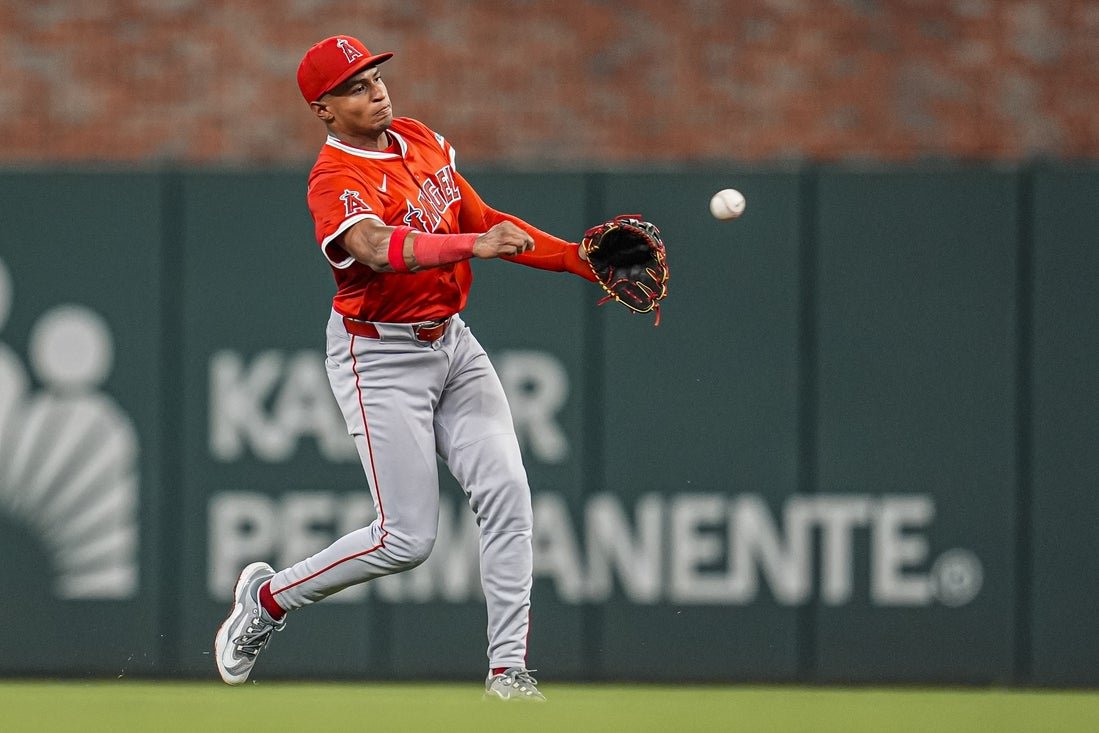 Jul 1, 2025; Cumberland, Georgia, USA; Los Angeles Angels second baseman Christian Moore (4) throws out Atlanta Braves designated hitter Marcell Ozuna (20) (not shown) during the eighth inning at Truist Park. Mandatory Credit: Dale Zanine-Imagn Images The Los Angeles Angels placed rookie second baseman Christian Moore on the 10-day injured list on Thursday because of a left thumb sprain.
