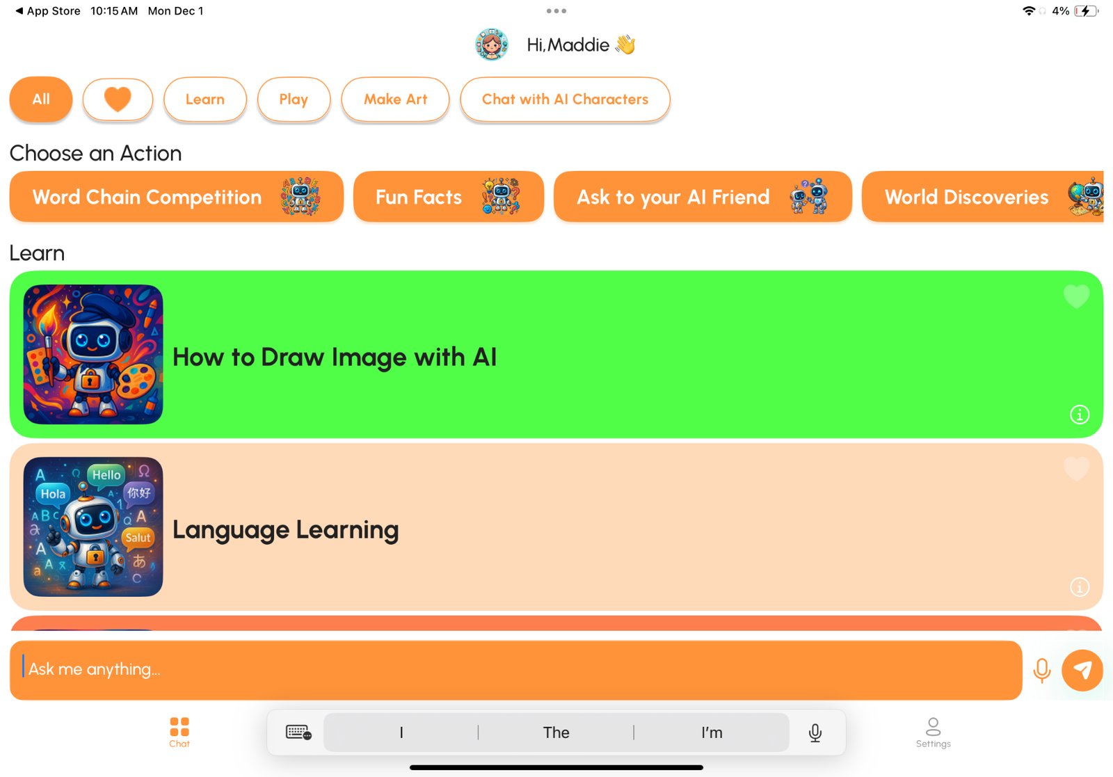 The app has a ton of different ways for kids to enjoy it. In the Learn section, they can learn a new language, get help with homework, and more. Play is all about fun and games with a funny joke factory and more. Kids can also make art and even chat with AI characters like Spider-Man and Einstein.