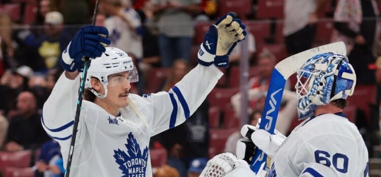 Dec 2, 2025; Sunrise, Florida, USA; Toronto Maple Leafs defenseman Philippe Myers (51) celebrates with goaltender Joseph Woll (60) after the game against the Florida Panthers at Amerant Bank Arena. Mandatory Credit: Sam Navarro-Imagn Images The Carolina Hurricanes could benefit...