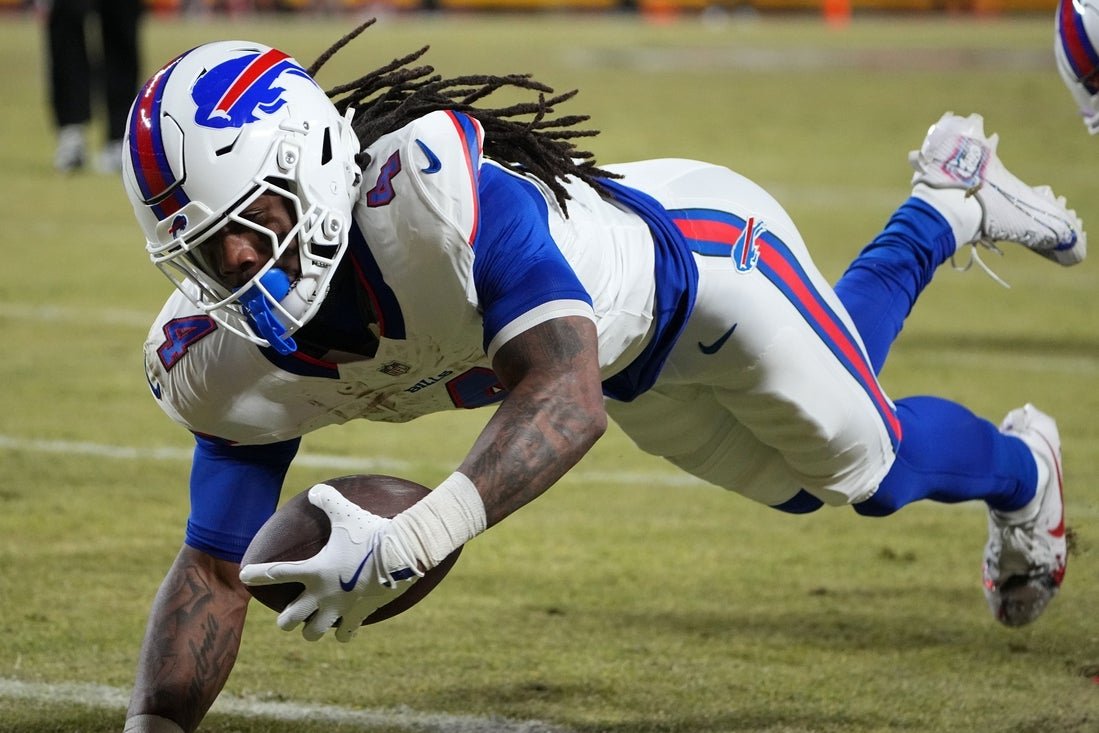 Jan 26, 2025; Kansas City, MO, USA; Buffalo Bills running back James Cook (4) dives for a touchdown against the Kansas City Chiefs in the AFC Championship game at GEHA Field at Arrowhead Stadium. Mandatory Credit: Denny Medley-Imagn Images Buffalo Bills running back James Cook can carry the “check, please” approach through training camp because of his confidence level a big payday is coming soon.