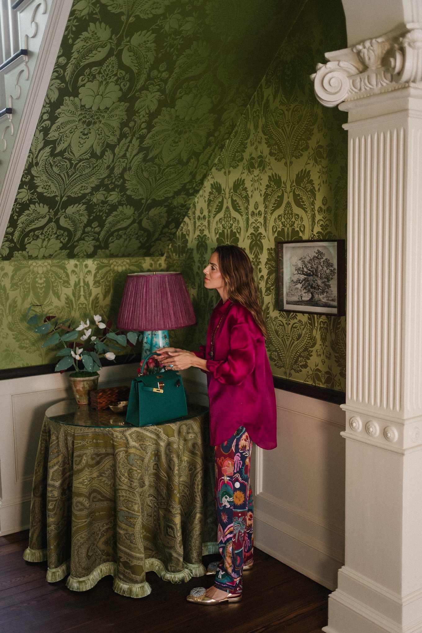 Kallmeyer Top, Farm Rio Pants, JB x Jennifer Behr Necklace, Chanel Flats (similar here), Hermes Bag (on the RealReal here, similar here)