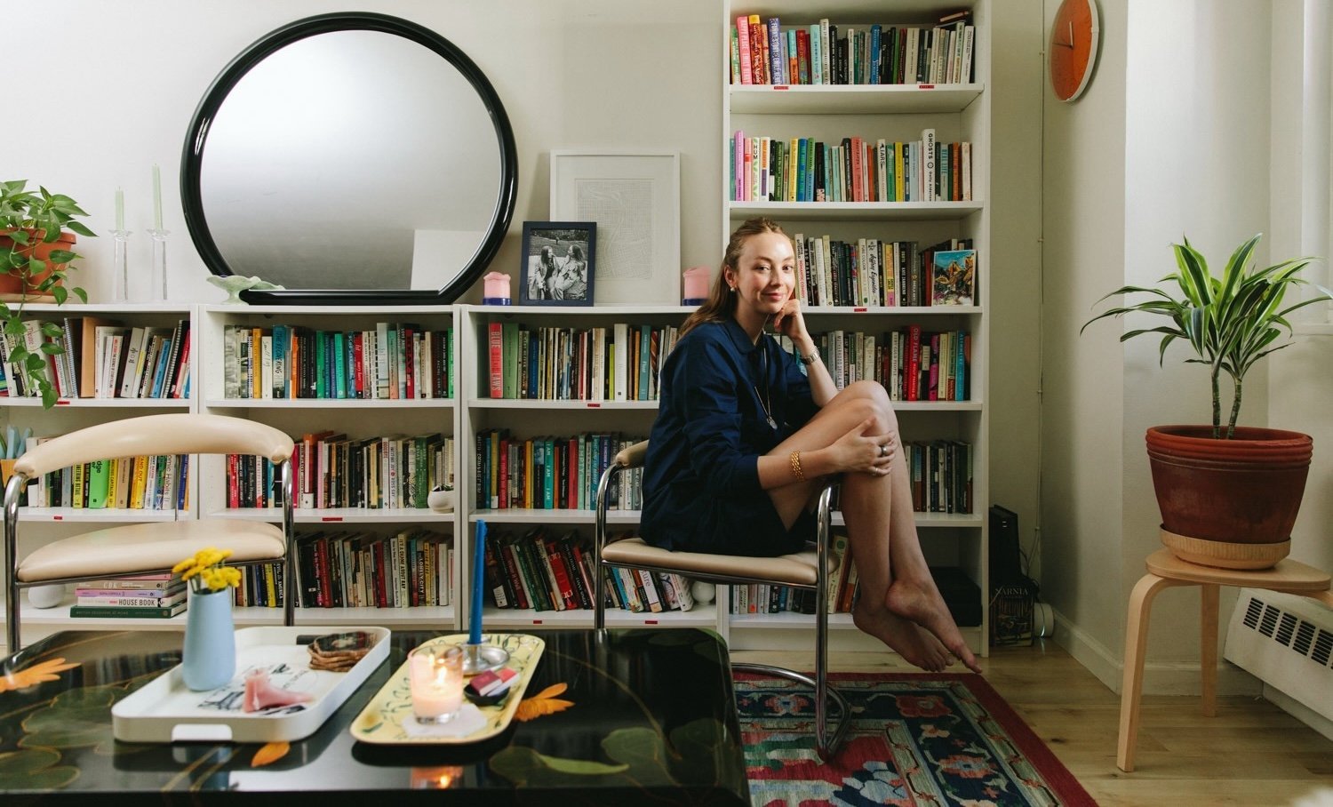 Paint: White Dove by Benjamin Moore. Mirror: Craigslist, similar. Bookshelves: Ikea. Chairs: Reuse America. Coffee table and globe pendant: Craigslist. Wall clock: Umei. Rug: eBay.