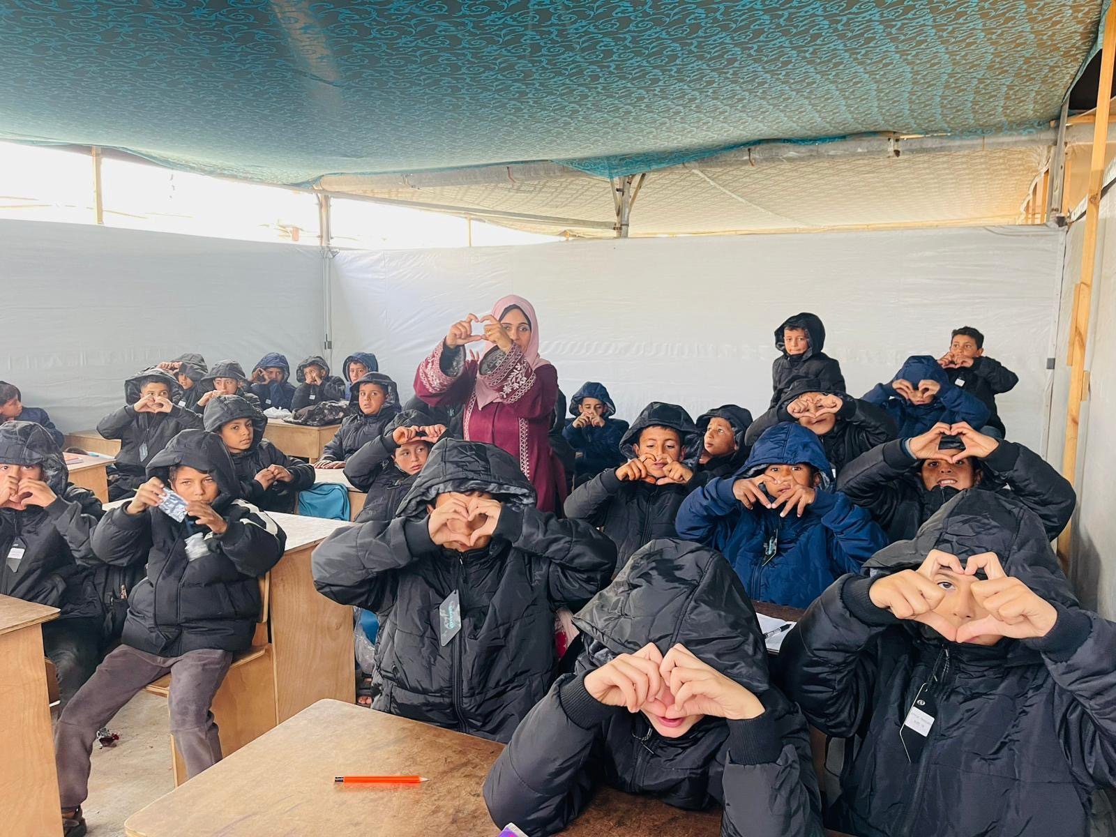A newly donated winter jacket is fitted for an Academy of Hope student in the Gaza Strip. (Photo courtesy of Gaza Children Village)