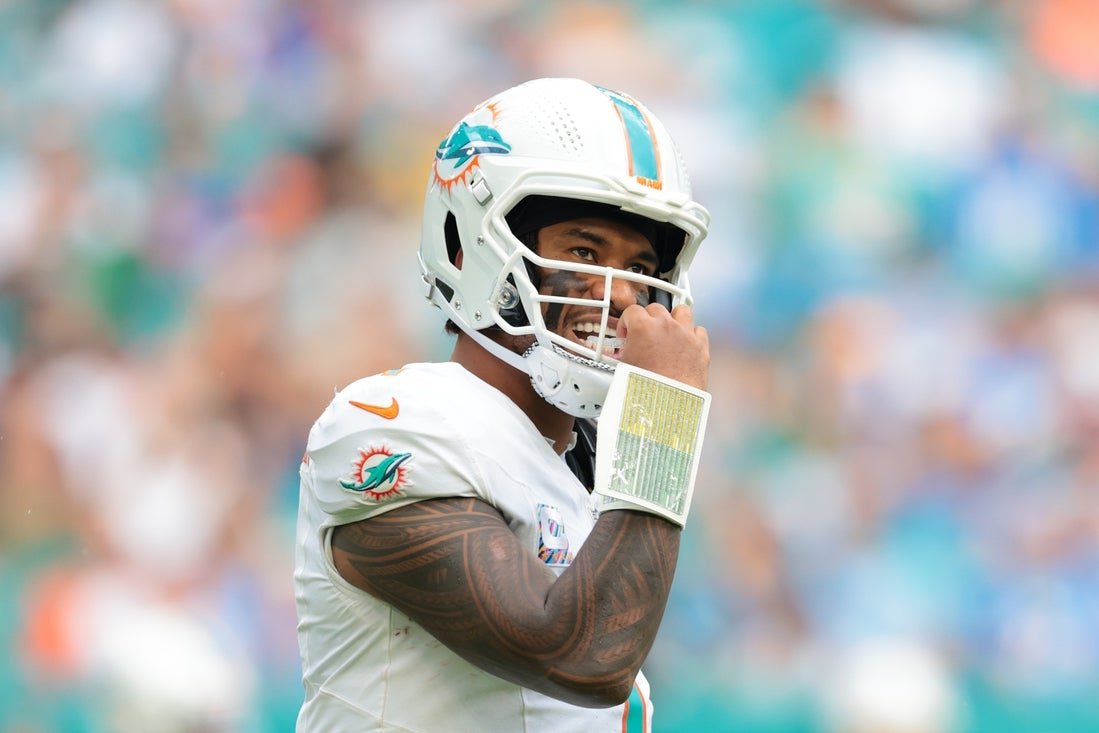 Oct 12, 2025; Miami Gardens, Florida, USA; Miami Dolphins quarterback Tua Tagovailoa (1) looks on from the field against the Los Angeles Chargers during the third quarter at Hard Rock Stadium. Mandatory Credit: Sam Navarro-Imagn Images Dolphins head coach Mike McDaniel considered quarterback Tua Tagovailoa’s criticism Sunday of teammates for tardiness and attendance to meetings “misguided.”