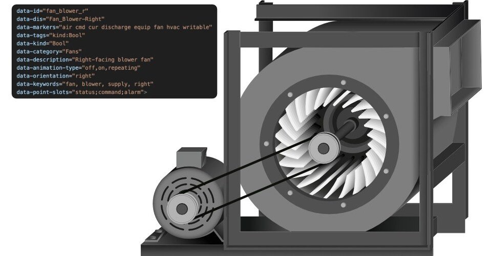 Vectortology transforms conventional illustrations into structured system components aligned with BAS data models. Each symbol carries equipment classification based on Haystack semantics point slot mappings for status command and alarm orientation logic to support automated template placement defined animation states mapped to operational behavior ontology based naming compatible with legacy or custom naming schemes and searchable semantic attributes for cataloging and retrieval.