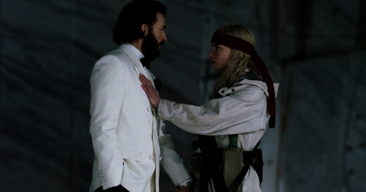 Introduced lying on the ground listening to the earth (“Mother,” she says in voiceover, “the volcano spoke to me … the world must burn”), Taylor-Joy’s Joan and her militants arm up and breach the summit by tasing one (1) unarmed security guard. She believes in “the cleansing power of death,” and seeks three human sacrifices to correspond to a witchy but blandly universality cosmology. The Bride, the King, and the Hero will save humanity, by being cast into the raging volcano whose imminent apocalyptic fury is a proxy for climate change. (Surely this messianic splinter cell would want their sacrifice to feed the volcano’s rage and purge the earth of people, rather than pacifying it so business can continue as usual?)