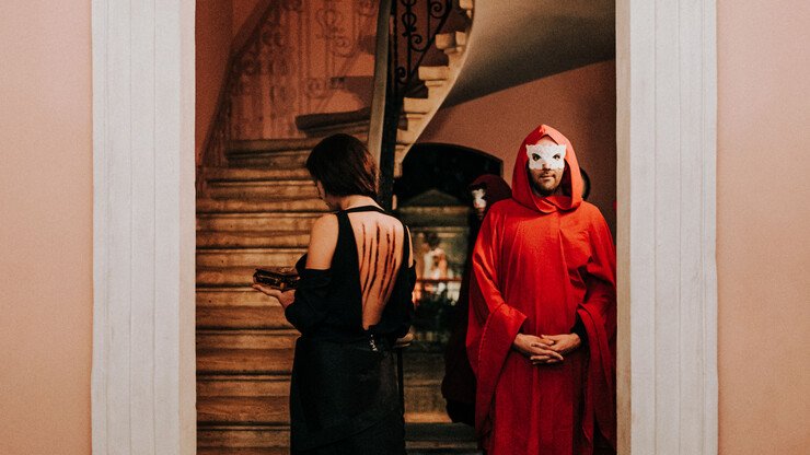 An actor in a red robe and white mask in a stairway with another actor in a black backless dress.