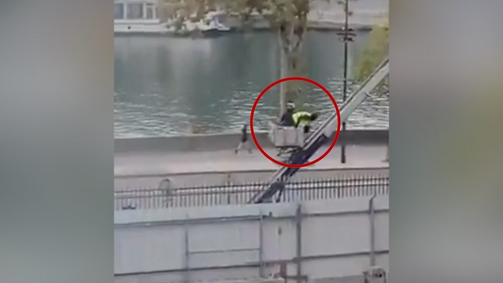 In the video, the truck fitted with the ladder is seen parked by on a busy road running along the Seine as vehicles pass.