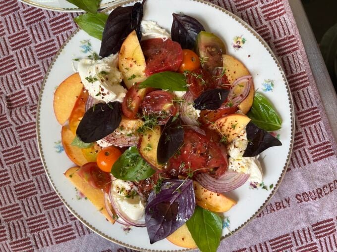 First, I take two or three large heirloom tomatoes, cut out the cores, and slice them into thick rings which I place on to two plates (this is for two people). Then I do the same with two ripe peaches or nectarines, except I cut those into wedges and tuck them between the tomatoes. I finally cut some fresh mozzarella into chunks and tuck that between the peaches and tomatoes. Then I drizzle everything with good olive oil, syrupy balsamic vinegar, Maldon sea salt, and Aleppo pepper. That’s part one. Part two is I take a bunch of assorted heirloom cherry tomatoes, cut some in half, leave a few whole and toss them in a bowl with chopped red onion, tons of torn green and purple basil, more olive oil, salt, and balsamic. Then I sprinkle that mixture over the peach/tomato/mozzarella mixture and add even more basil, for presentation.